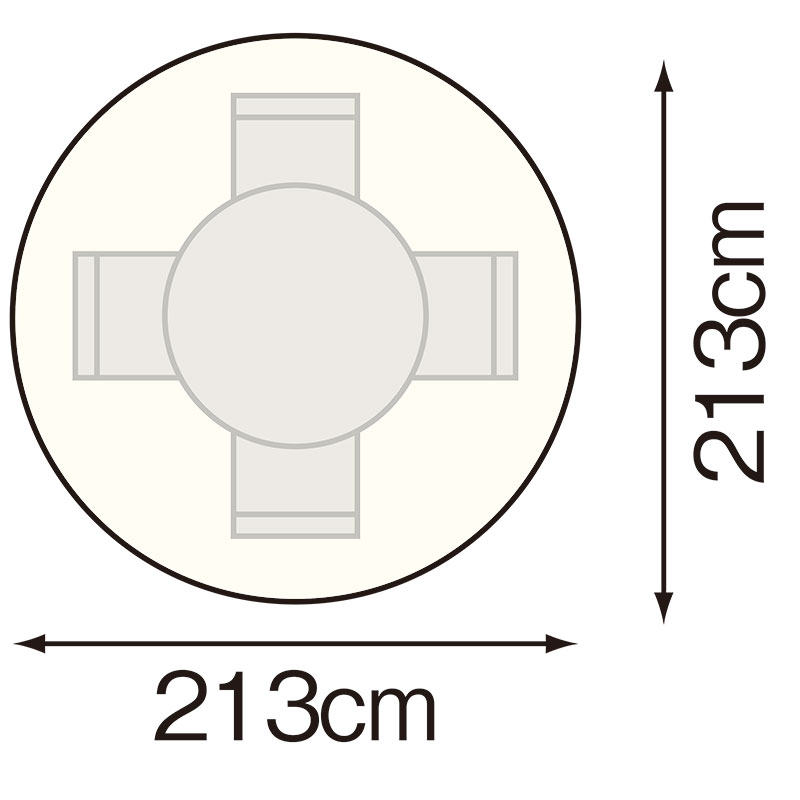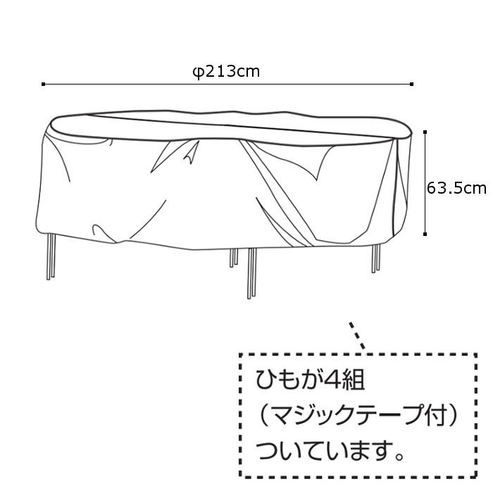 サイズ 約直径213×高さ63.5cm 重量 約1.8kg 素材 ポリエステル(撥水加工) ※円形のテーブル5点セット(テーブル1台、椅子4脚)用です。