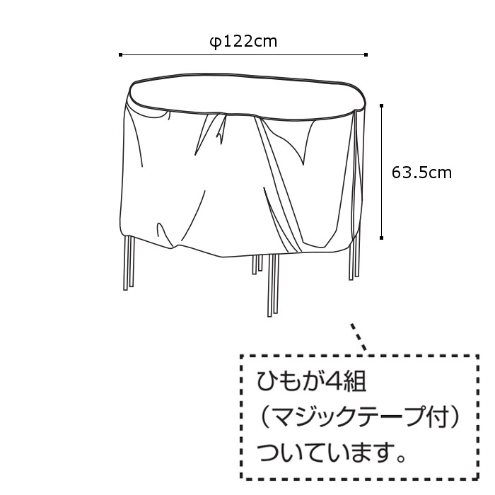 サイズ 約直径122cm×高63.5cm 重量 約0.95kg 素材 ポリエステル(撥水加工) ※ビストロカフェテーブル3点セット(テーブル1台、椅子2脚)用です。